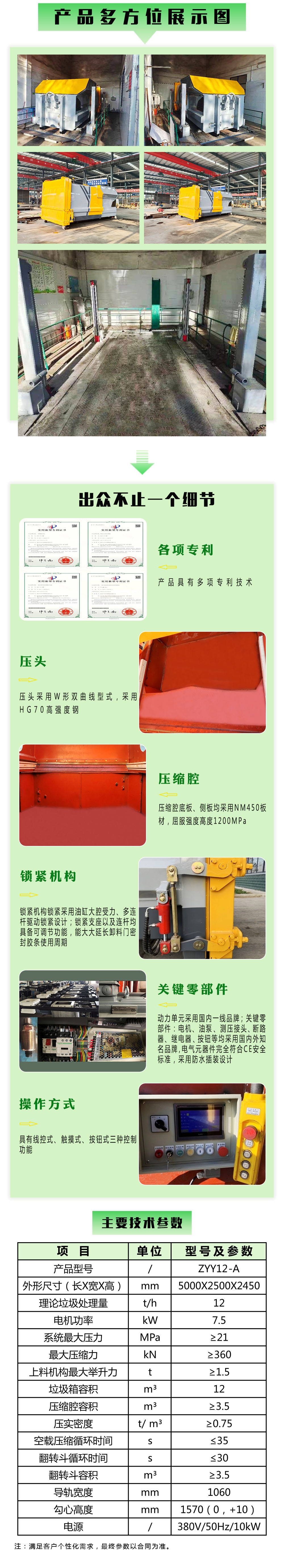 景观式智能移动压缩转运站设备,为我公司引进德国技术而研发的新一代垃圾压缩处理设备,该设备由压缩腔、压缩头、滑盖油缸、滑盖,进料口,压缩垃圾存储部分、后门总成及锁紧密封系统、液压系统、电器控制系统和操控装置等组成,配套拉臂车移动使用。设备具有结构紧凑、布置灵活、操作方便、不需建设厂房和基础等特点,在针对城市中心区域垃圾转运站点垃圾量大,场地选址受限,环境要求高等特点,适用于街道社区、医院、学校、公园、广场等各种垃圾收集转运的场所,是城市环卫部门、各种企事业单位垃圾处理装备的一种理想选择。
