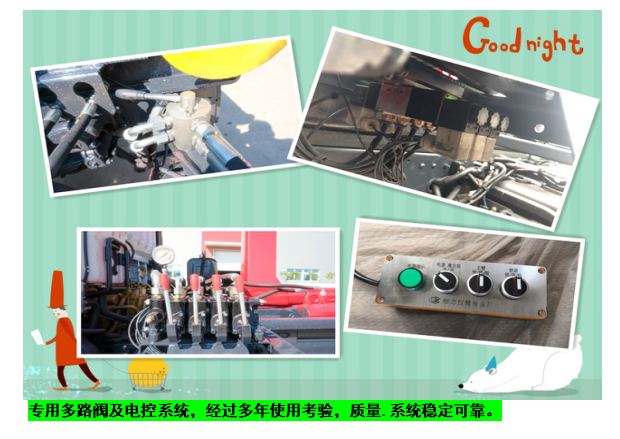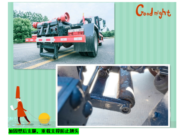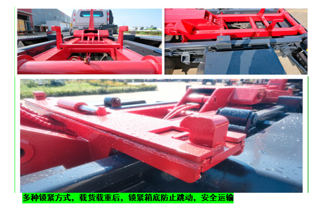 ◇上装配置:强度合金钢一体式主勾臂,加强型副梁,铸钢尾托轮,手自一体室内外液压操控,上装提升能力6000KG, 液压完成上箱+下箱+锁紧+自卸等作业,实现一车配多箱的循环转运。可采用加强型上装,伸缩臂,油缸加粗,加装液压支腿,搭配建筑垃圾箱使用,提升能力10000Kg。