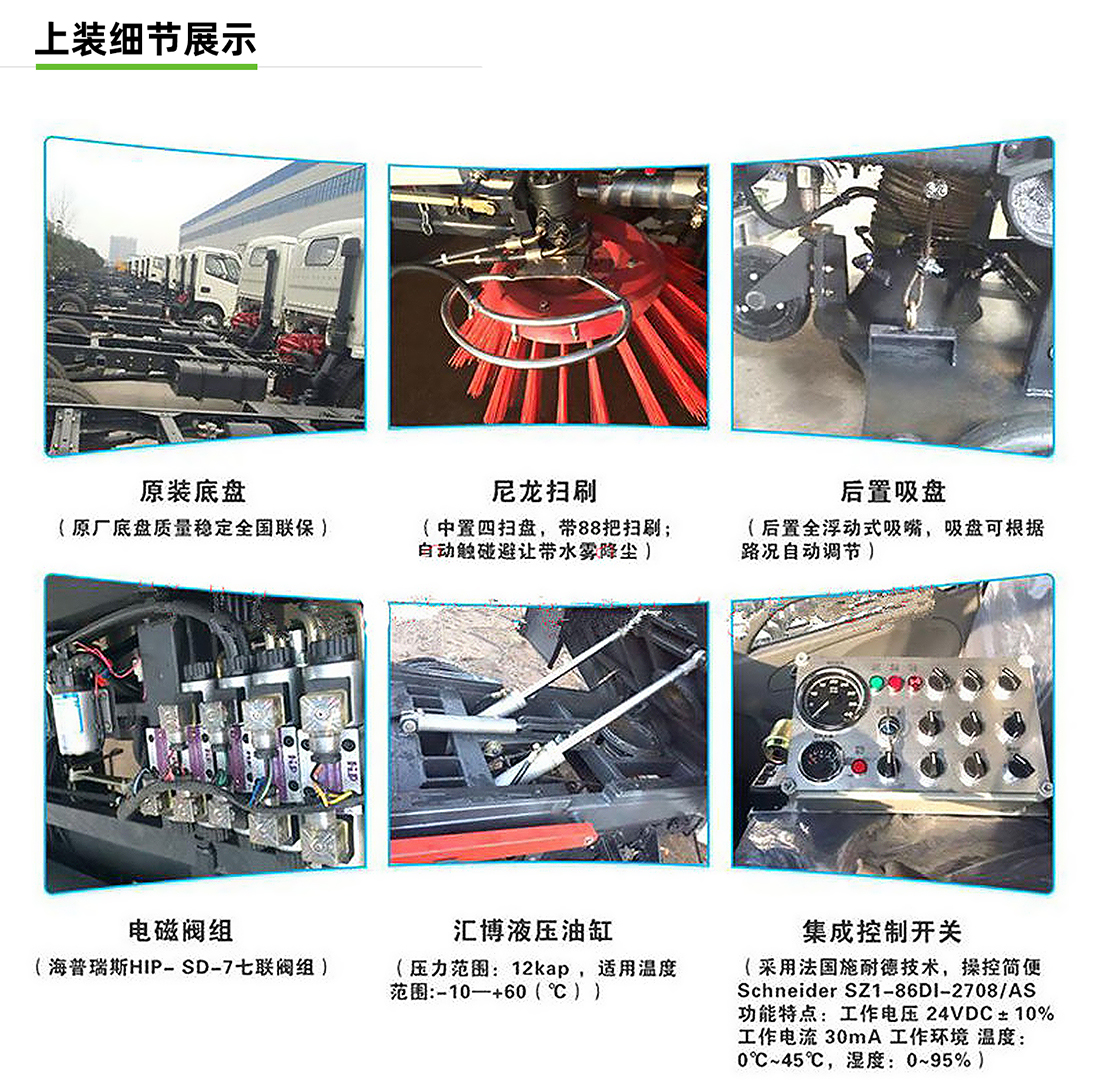 东风小多利卡5方吸尘车专用配置:尘箱:4立方米,水箱:1立方米;中置吸盘、江铃五十铃副发动机、施耐德控制开关、海普瑞斯电磁阀组、无级变速自动离合器、免维护离心式风机、高精度垃圾箱过滤系统(最高可达0.5微米),不锈钢垃圾箱、进口脉冲阀、垃圾箱举升自卸、尾部LED箭头灯、车尾雾状喷水润湿功能、倒车影像、手动泵应急系统。