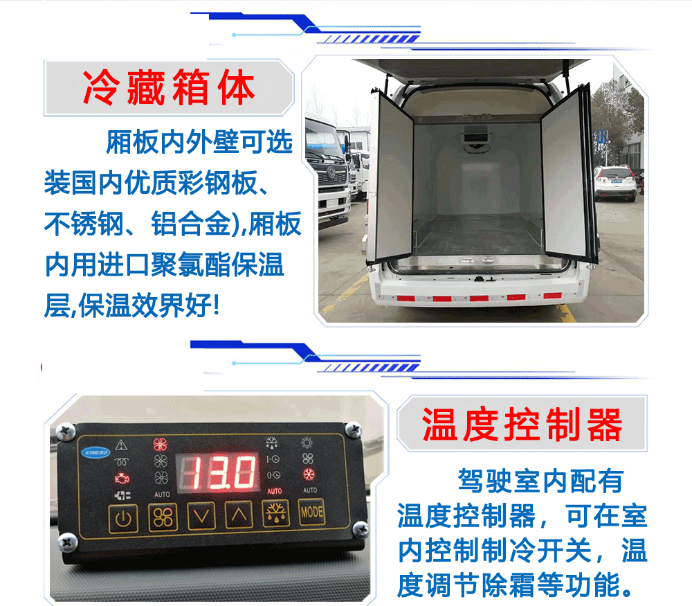 上装配置:箱体为内外玻璃钢板,中间保温材料为8cm聚氨酯保温板,铝花纹底板,箱体铝合金型材包边,包角,配双开后门,单开侧门,不锈钢门框、锁件、铰链,其余