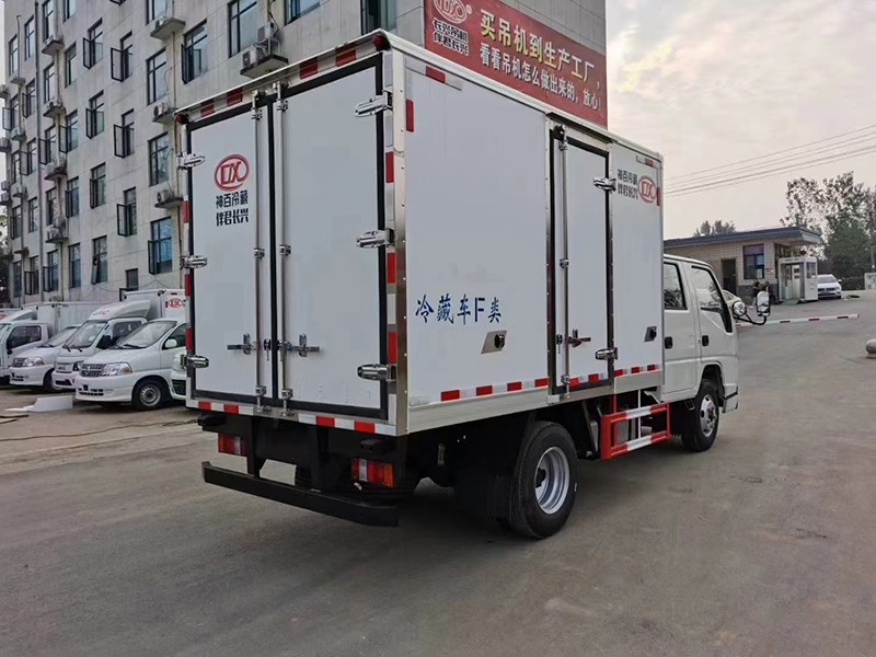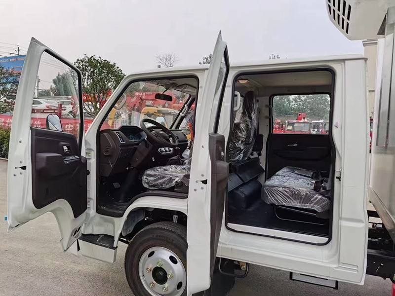 江铃顺达双排冷藏车,整车型号:AAA5043XLCJX6,整车尺寸:5995×1980×2900,厢体尺寸:3250×1800×1800,五十铃115马力发动机,5档变速箱,原厂空调,助力,ABS,油刹,轴距3360,7.00R16LT 8PR轮胎,厢体采用内外玻璃钢、中间8CM 厚聚氨酯保温板、底板为防滑花纹铝板,单开侧门,不锈钢门锁件,-15度制冷机组,其余标配。